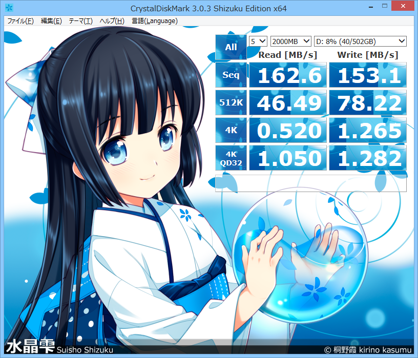 ディスクのベンチマークなのでディスクのベンチマークでは王道?のCrystaalDiskMarkを使います。ShizukuEditionです。