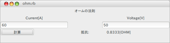 まぁRubyとGTK2の練習がてらにオームの法則を使って抵抗値を求めるというのを作ってみました。